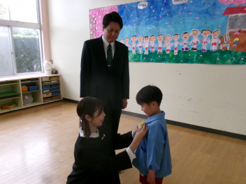 保護者の方にコサージュを付けてもらいました。