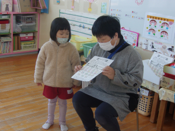 年長さんは、ダイコンとニンジンのお店の散らしを配りに行きました。たくさんの人に買ってもらいたいという願いをもって、子供たちが考えました。
