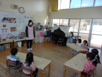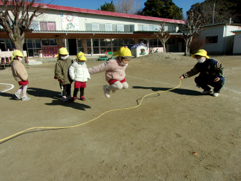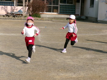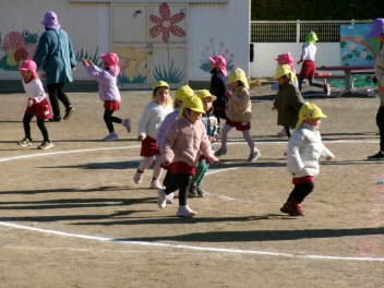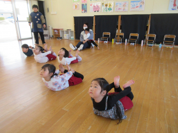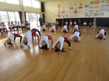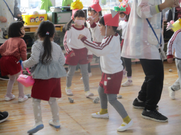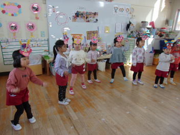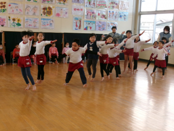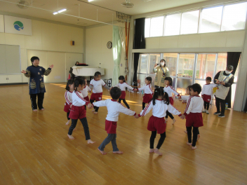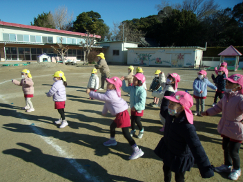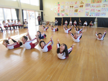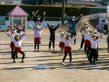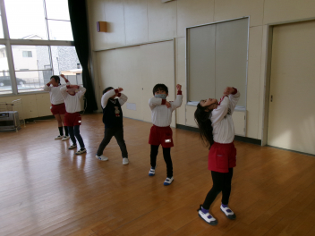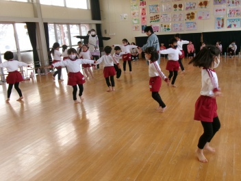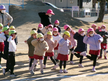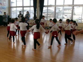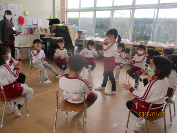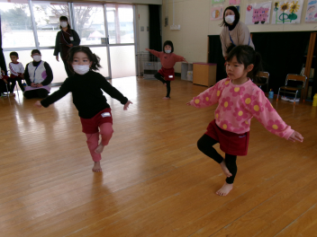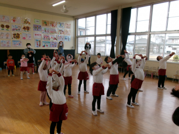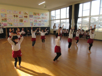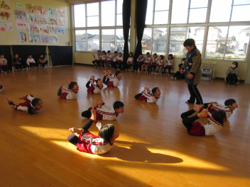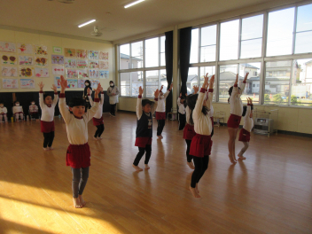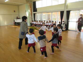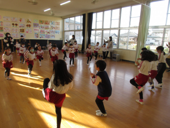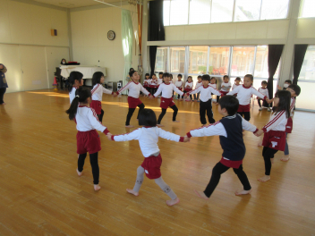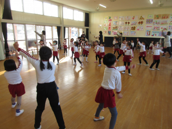 • 今日は、風が強く、少し寒い1日となりました。そこで、遊戯室で、全学年でリズム運動を楽しみました。