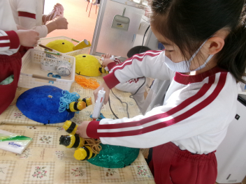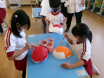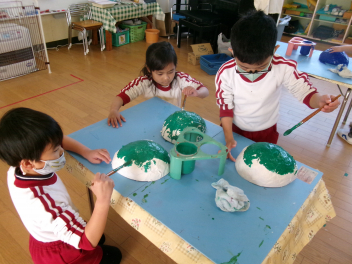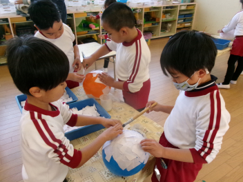 はる組さんは、友達と協力しながら風船に紙を貼り付けています。