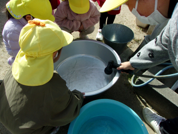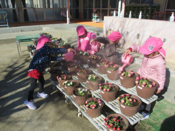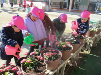 石拾いの後、もも組さんは、大事に育てている一鉢栽培の花に水をやりました。
