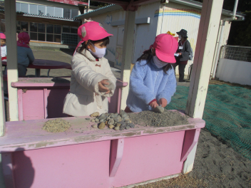 砂でつくったケーキで、ケーキ屋さんごっこも楽しみました。