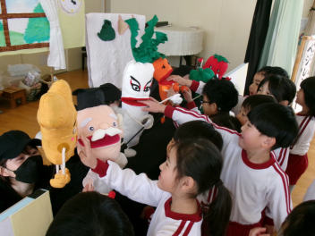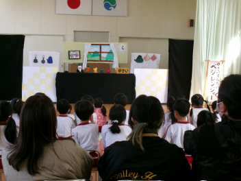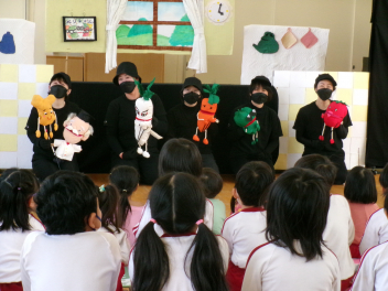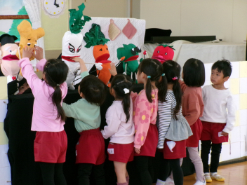 お楽しみは、人形劇「こんぺいとう」の方が「やさいせんたい ベジレンジャー」のお話をしてくださいました。