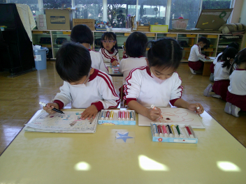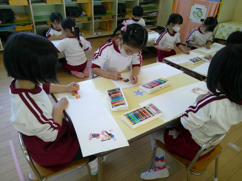 もも組さんは、クレパスで自分と好きな絵をかきました。