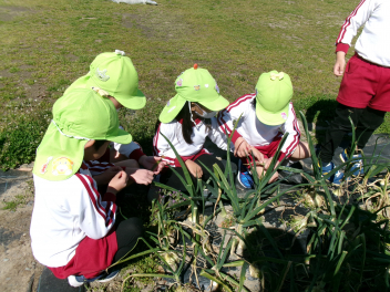 振り返りの後、畑に行き、タマネギの葉っぱを観察しました。でこぼこしている葉が少なくなっていることに気付きました。