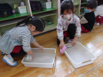 ひよこ組さんは、自分の使ったかごや靴箱、ロッカーなどを丁寧に拭いていました。