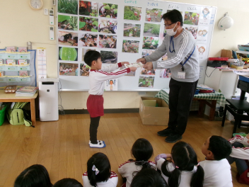 3学期も、「不思議だな。」「調べてみたいな。」と思ったことを、家庭で自分なりに調べ、カードにかいてきてくれた子がいました。今学期は、2人の子が、園長先生から賞状をいただきました。