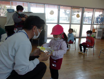 美味しいお弁当をつくってくださった「はまちゅうさん」に、はる組さんからお礼のプレゼントを渡しました。