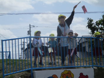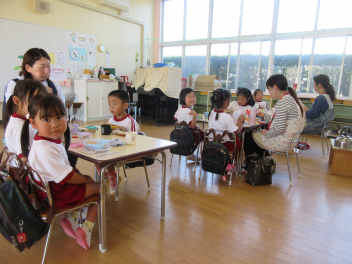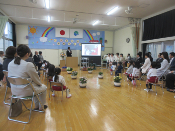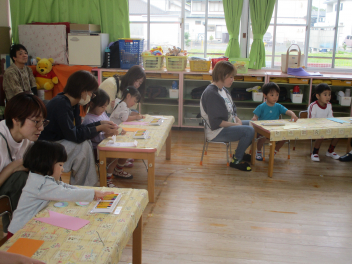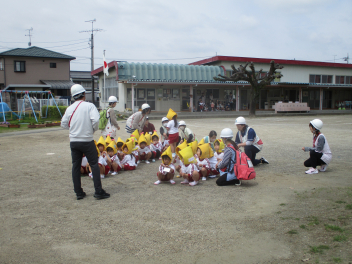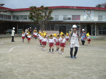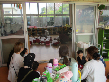 ひよこ組さんは、はる組さんの避難の様子をお家の人と見学。