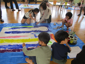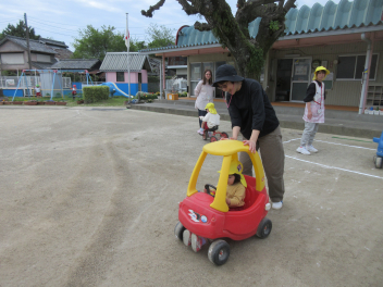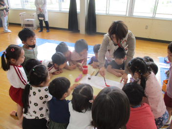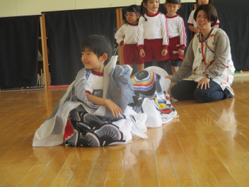 はる組さんは、大きなこいのぼりに入って楽しんでいました。