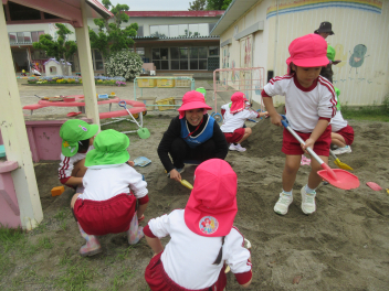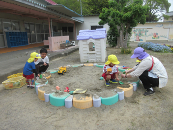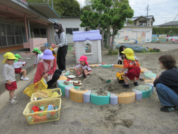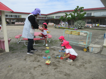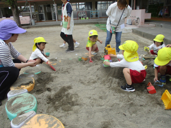 ひよこ組さんは、砂場で先生と一緒に型抜き。