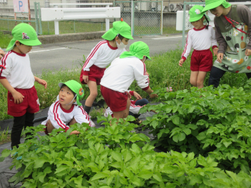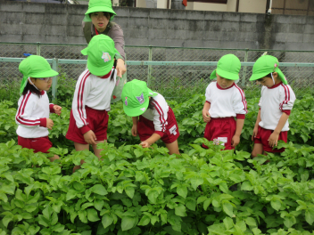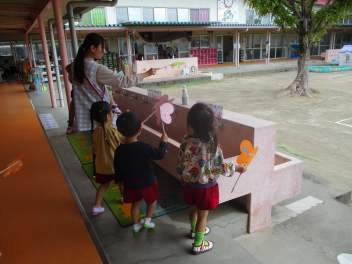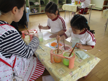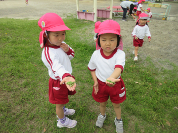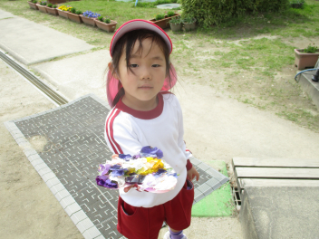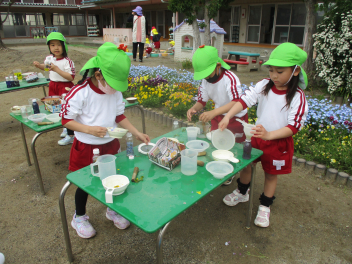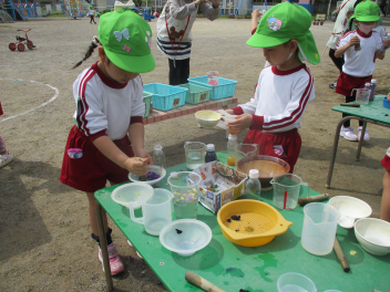 園内の草花を使って、色水遊びを楽しむはる組さん。