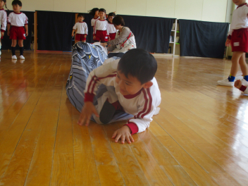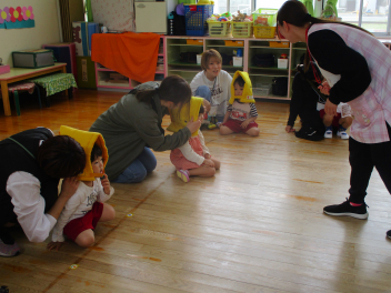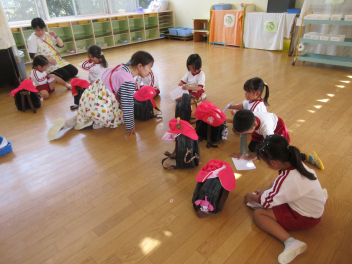 訓練後、ひよこ組さんはお部屋で「だんごむしのポーズ」や防災頭巾を実際に被る練習をしました。