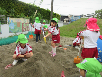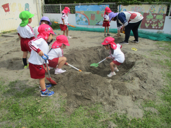 砂場では、力いっぱいスコップを使って、大きな穴が掘れていました。
