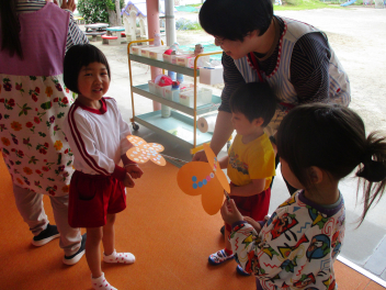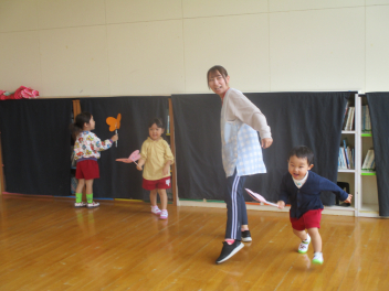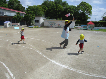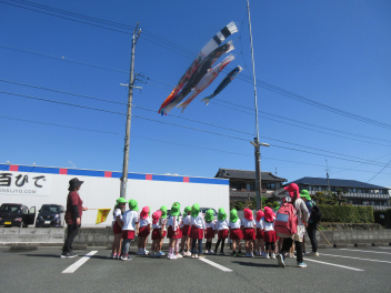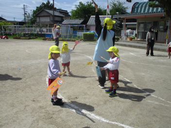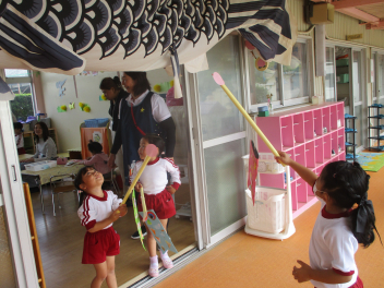 もも組さんは折り紙こいのぼりを飛ばして遊んでいました。
