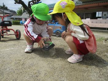 テントウムシ発見。じっと見つめる子もいました。飼育ケースにはたくさんの生き物がいっぱい!!