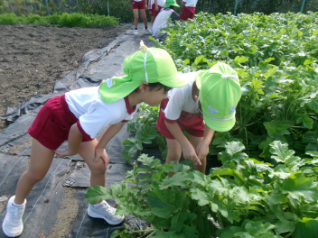 今日は、朝から、もも組さんとはる組さんが、ダイコンの虫取りを頑張りました。