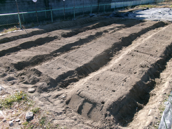 ボランティアさんがお手伝いをしてくださり、あっという間に畝が完成しました。