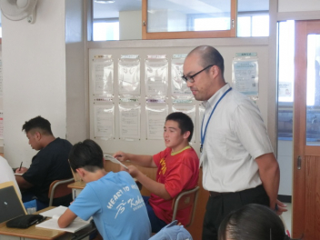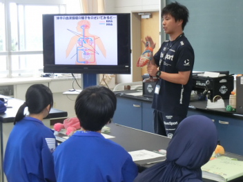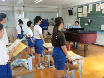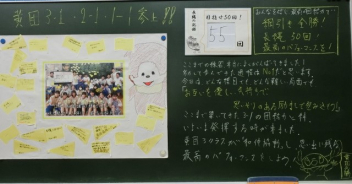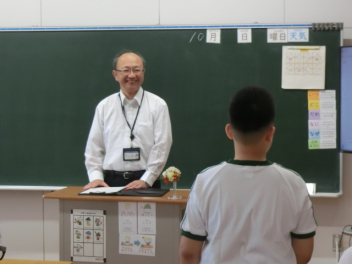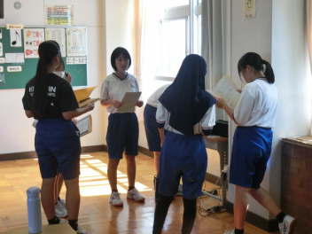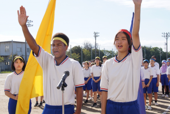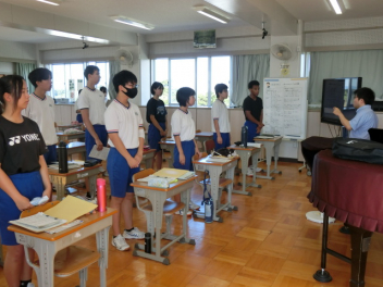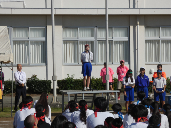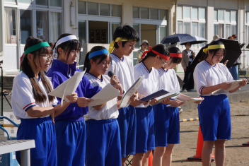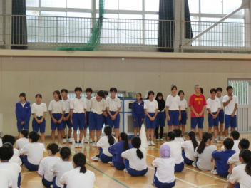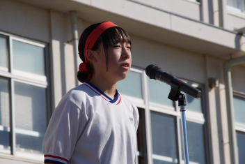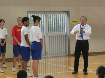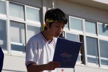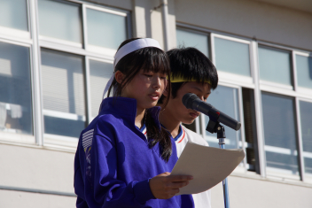 駅伝部の紹介です。25日に行われる浜松地区駅伝大会に参加するメンバーの紹介がありました。放課後や休日を使って、練習をしてきました。駅伝部創設からつながる襷を校長先生からキャプテンに渡されました。