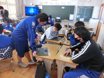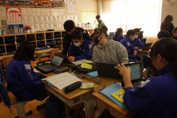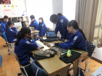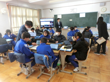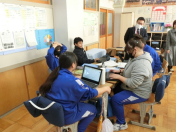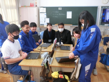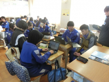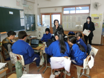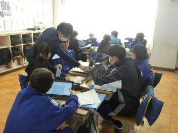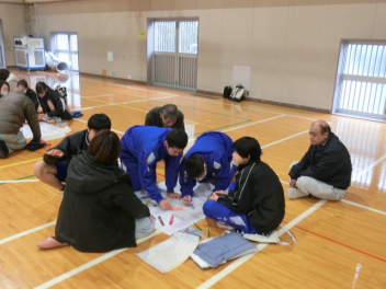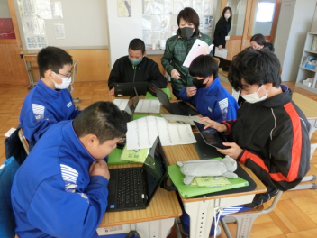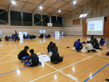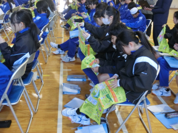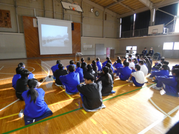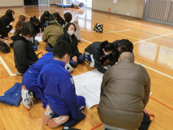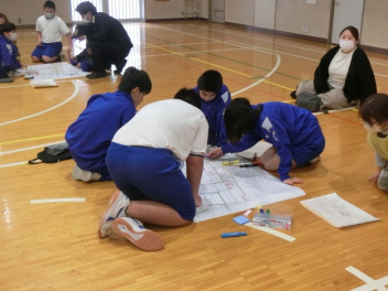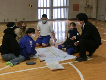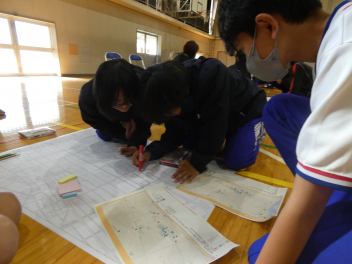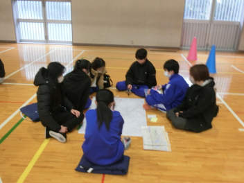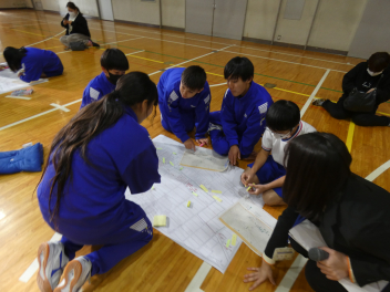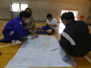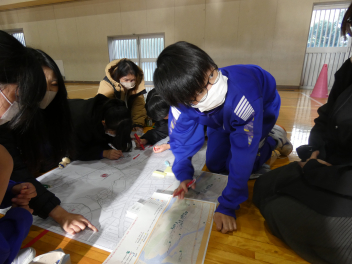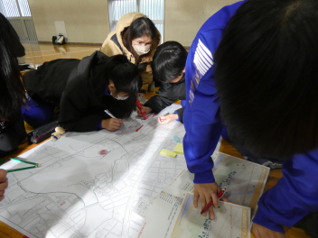 1年生は防災について学習をしています。南行政センターから、講師を招き、DIG訓練をしました。講話を聞いた後、地域ごとに分かれて、自然災害から身を守るために、近所の危険箇所や避難ルートの確認などをしました。保護者や自治会の方も参加し、アドバイスしていただきました。地震や津波発生時に慌てずに冷静な判断がとれるようにしていきたいです。