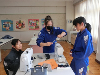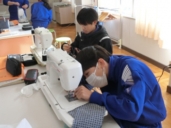 1年生の家庭の裁縫の授業です。ミシンを使って、ハートのケースを作っています。