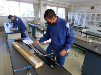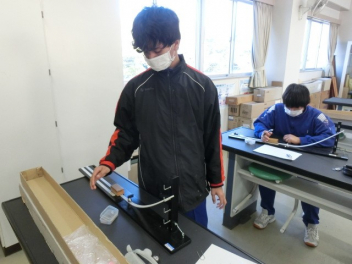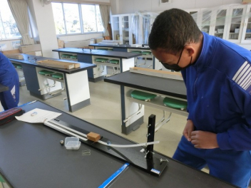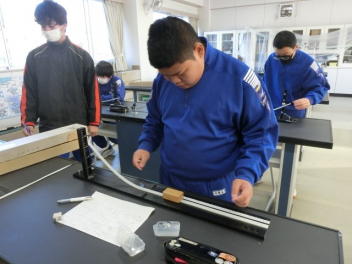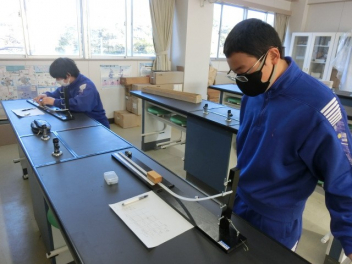 理科の授業の様子です。運動エネルギーの大きさは何によって変わるのか、ペットボトルキャップを用いて実験しました。キャップをボウリングのピンに見たて、指でキャップをはじき、簡易速度測定器でスピードを測定しました。