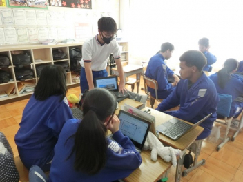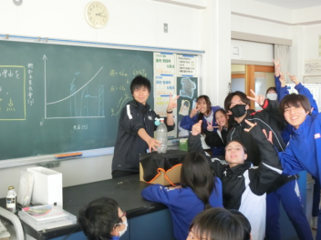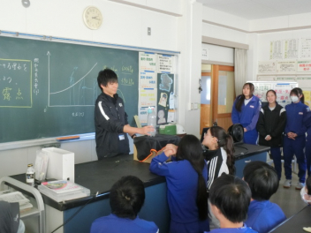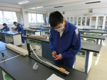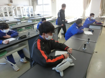 3年生の理科の授業です。位置エネルギーと運動エネルギーの移り変わりを「振り子の運動」を用いて、実験をしました。追加の課題として、曲のテンポに合う振り子にするためにどうしたらよいか、条件を変えて実験しました。途中から、みんなで校歌を熱唱しながら実験しました。