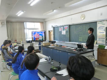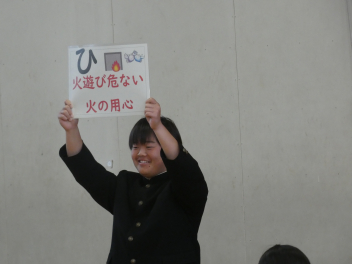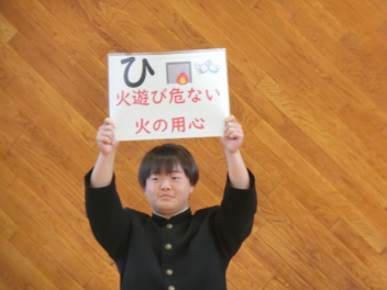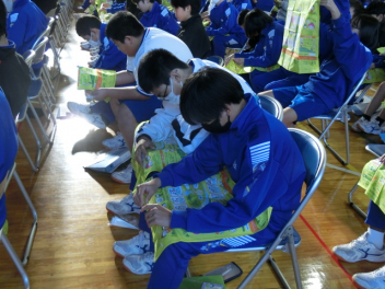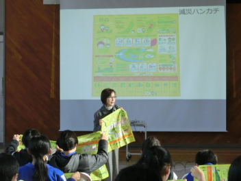 最初に地震や津波など自然災害のメカニズムと減災行動について学習しました。基礎的な自然災害を科学の視点で学習しながら減災の意味を考えました。減災のことをわかりやすく解説した減災ハンカチ「結」についての説明を聞きました。
