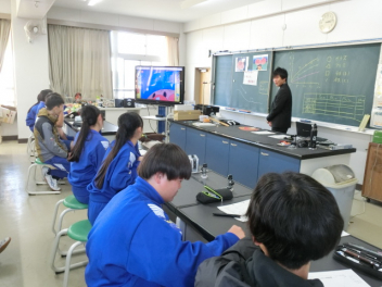 授業の様子です。家庭科では、ミシンを使って、裁縫を行いました。理科では、仕事とエネルギーの実験、雲の発生の実験、古代生物の模型製作を行いました。