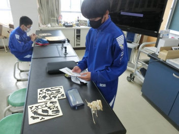 1年生の技術の木材加工の授業です。ブックスタンドを製作します。作品例がいくつかある中で、何を作ろうか考えました。
