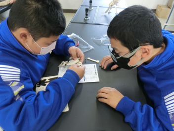 1年生の理科です。「フックの法則」について実験をしました。ばねに重りを1つずつ付けていき、重りの個数とばねの伸びを計測しました。「ばねののび」が「ばねに加わる力の大きさ」に「比例」することがわかりました。
