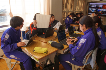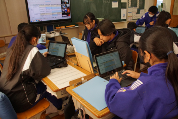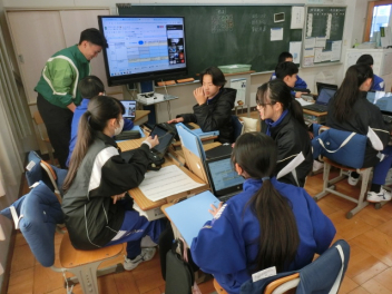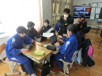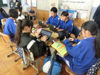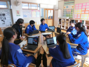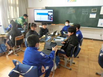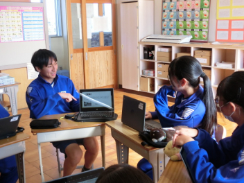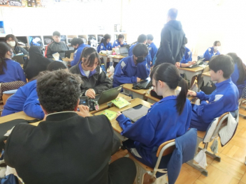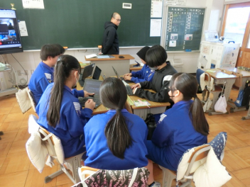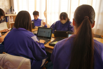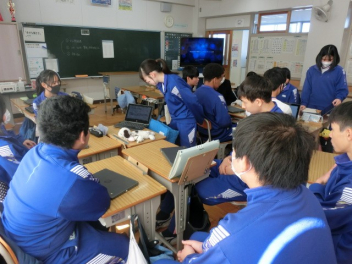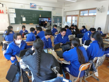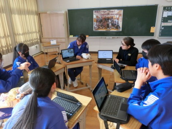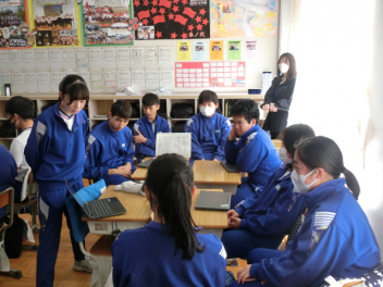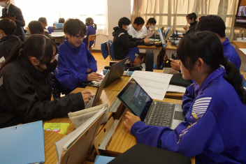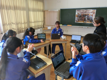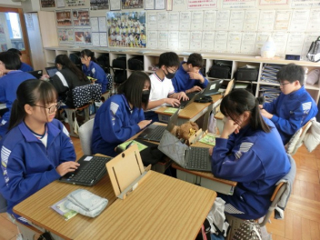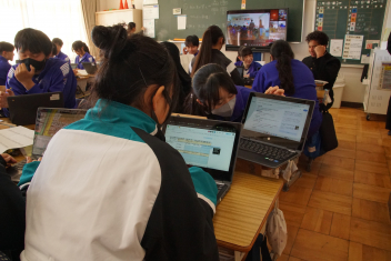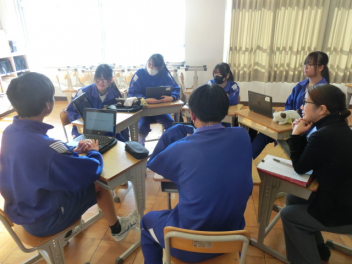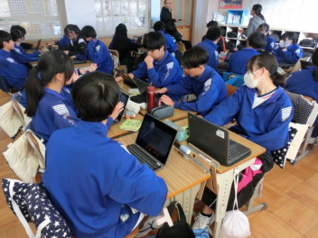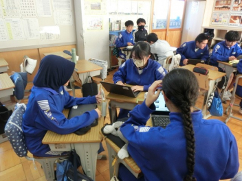 英語の授業で、世界が抱える課題について考えました。気候変動や森林破壊、絶滅危惧種、戦争、水質汚染などについて、原因を考え、私たちにできることは何かを英語で提案しました。難しい単語や表現がありましたが、ジェスチャーを使って自分の考えを伝えました。