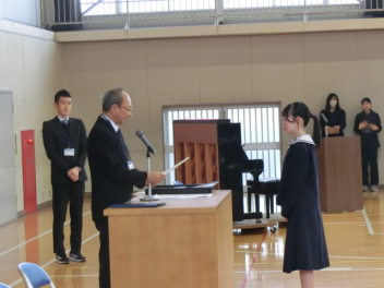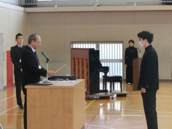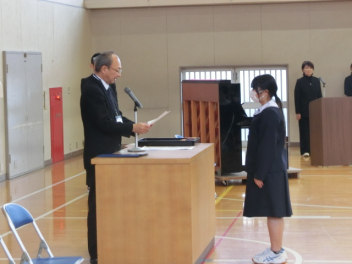2学期終業式を行いました。最初に「教育論文学校優秀賞」「ポスターコンクール」「読書感想文」「書写」「ピアノコンクール」「英語スピーチコンテスト」「柔術大会」の表彰を行いました。