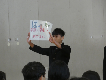 •  2年生は「10年後の自分に向けて~なりたい自分になるための決意の会~」を行いました。将来どんな大人になりたいか、どんな生き方をしたいか。10年後の自分を思い描きながら、よりよい人生を歩むために、今、具体的にできることは何かを考え、発表をしました。