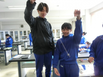 今週は、学校保健週間です。「ピアサポート(自分も相手も大切に)で笑顔になろう」をテーマに、保体委員が考えたゲームを昼休みに行いました。今日はグループでジェスチャーゲームをしました。