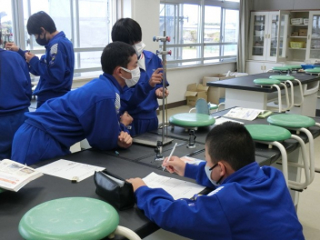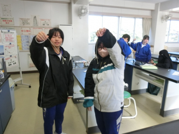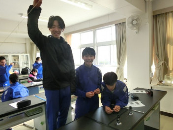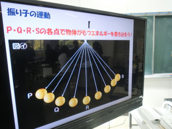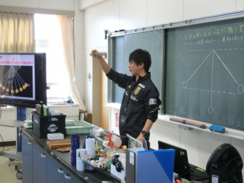 3年生の理科の授業です。位置エネルギーと運動エネルギーの移り変わりを「振り子の運動」を用いて、実験をしました。追加の課題として、曲のテンポに合う振り子にするためにどうしたらよいか、条件を変えて実験しました。途中から、みんなで校歌を熱唱しながら実験しました。