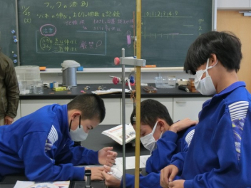 1年生の理科です。「フックの法則」について実験をしました。ばねに重りを1つずつ付けていき、重りの個数とばねの伸びを計測しました。「ばねののび」が「ばねに加わる力の大きさ」に「比例」することがわかりました。