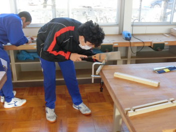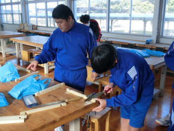 技術の授業です。木材加工で、ファンシーボックスを製作しています。