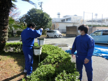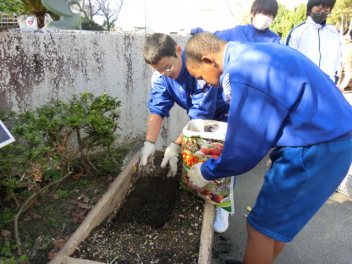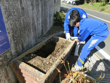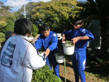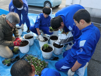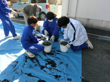理科で、ビオラの苗の植え付けを行いました。卒業式に向けて、学校を花で彩っていきます。