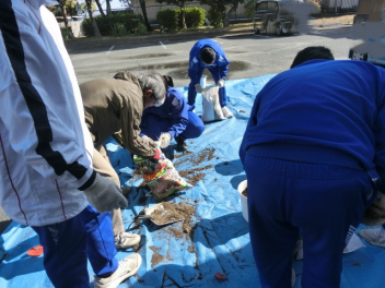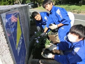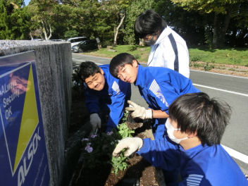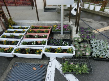 正門前の花壇とモニュメントの所にスイートアリッサムの花を植えました。春に向けて、準備を進めています。苗を植えるのも上手になってきました。