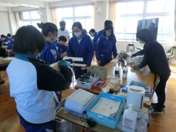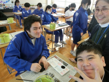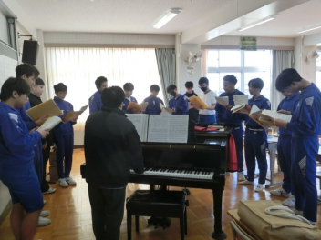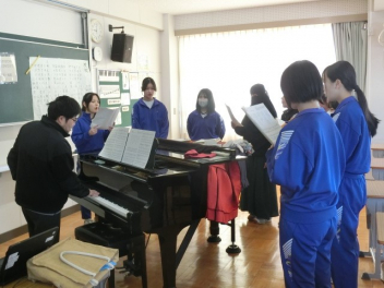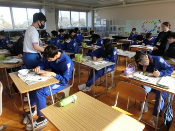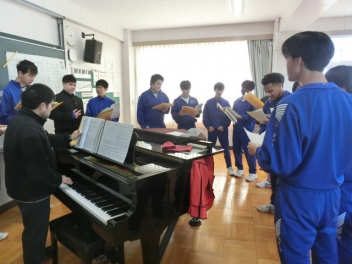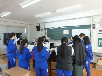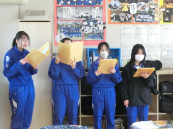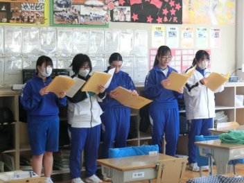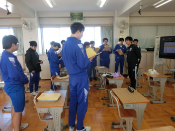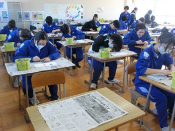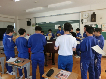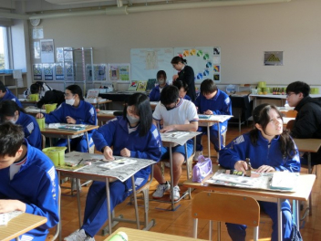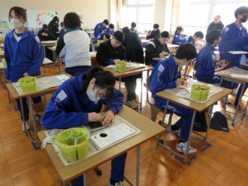 立春。3年生では卒業に向けた授業を行っています。私立高校入試のため、1,2組合同で音楽と美術の授業を行いました。音楽では、卒業合唱の練習を行いました。パートごとで練習をしてから、合わせて練習をしました。美術では、レザークラフトで印鑑ケースを製作しています。刻印や色付け、磨きの作業を行いました。