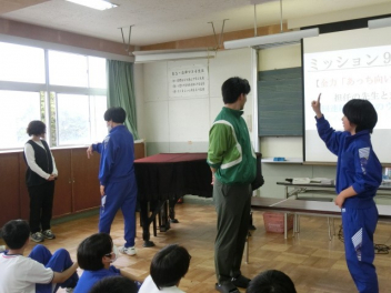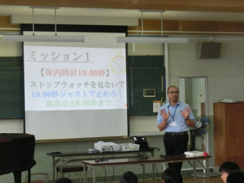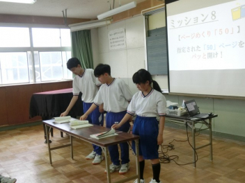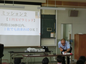 「できるできない選手権」の様子です。簡単そうに見えるけど、意外に難しい10のミッションに挑戦しました。体内時計10.00、1円玉ピラミッド、ページめくり50、担任の先生と全力あっち向いてホイなどのミッションです。