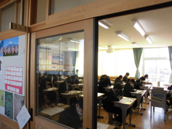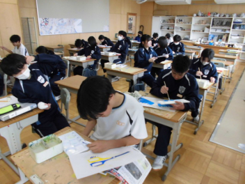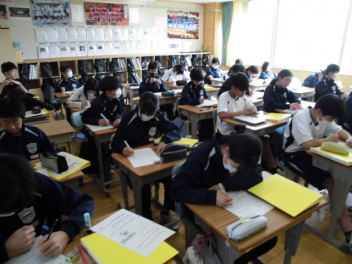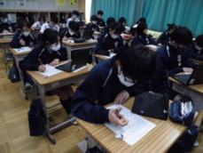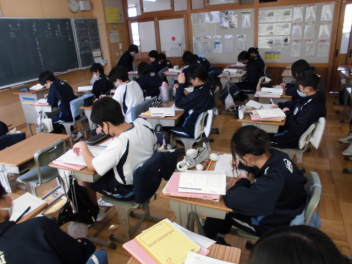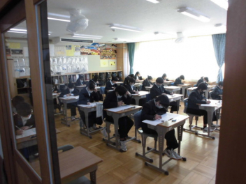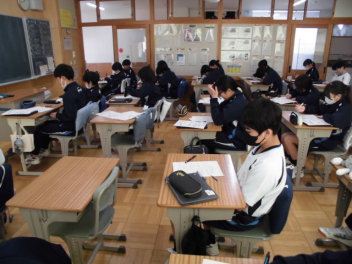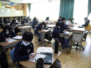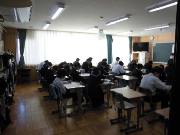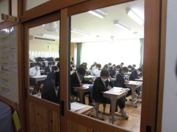 ◆国語では、文章構成の基本となる単語の活用について◆数学では、樹形図をもとにして確率を考える「もっといい確率の求め方は」◆同年代の日本と世界の歴史を比較する◆身近にある磁界と電気の関係について考えるsmiley ◇3年生の教室は、「シーーン カタカタ カタカタ…」入試前のリハーサル問題を集中して頑張っていました