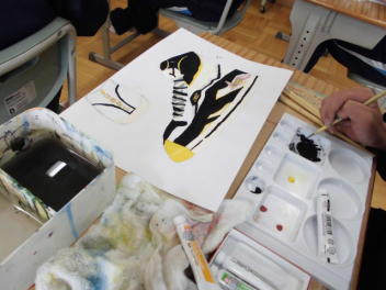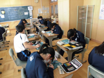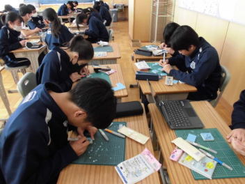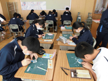 美術の「消しゴムはんこ」の制作も進んでいます 彫刻刀で「シュッ、シュッ チョイ、チョイッ