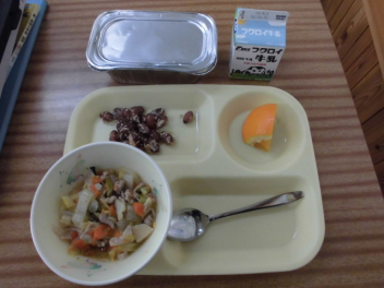 今日の給食は「御飯、牛乳、八宝菜、金時豆のごまがらめ、いよかん」