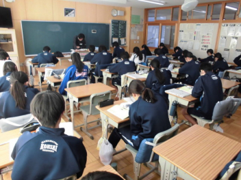 3年生の教室では、栄養教諭の先生が受験に向けての食生活についてお話をしてくれました