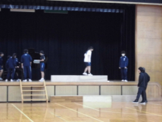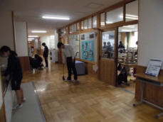 昼休みには、教室や廊下で自由にお話、体育館では3年生が準備中、廊下には美術作品の展示