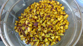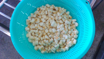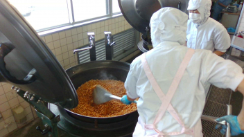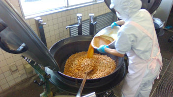 親子豆は、水で戻して片栗粉をまぶして揚げた大豆と、みそ・三温糖・みりん・水で合わせて作ったタレをからめて作りました。こちらのおかずも、いくらでも食べられそうなくらい箸がすすみます。