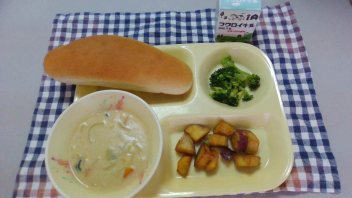 12日の給食は「サーモンシチュー・ブロッコリー・アップルポテト」です。お楽しみにしていてくださいね。
