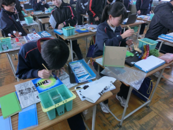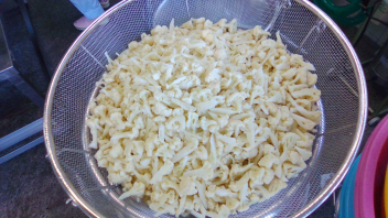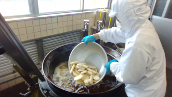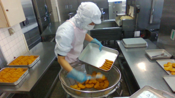 アップルポテトは、油で揚げたさつまいもにアップルソース・りんご果汁・砂糖を入れて作った甘酸っぱいソースをからめて作りました。デザート感覚で、甘いさつまいもを楽しむことができました。